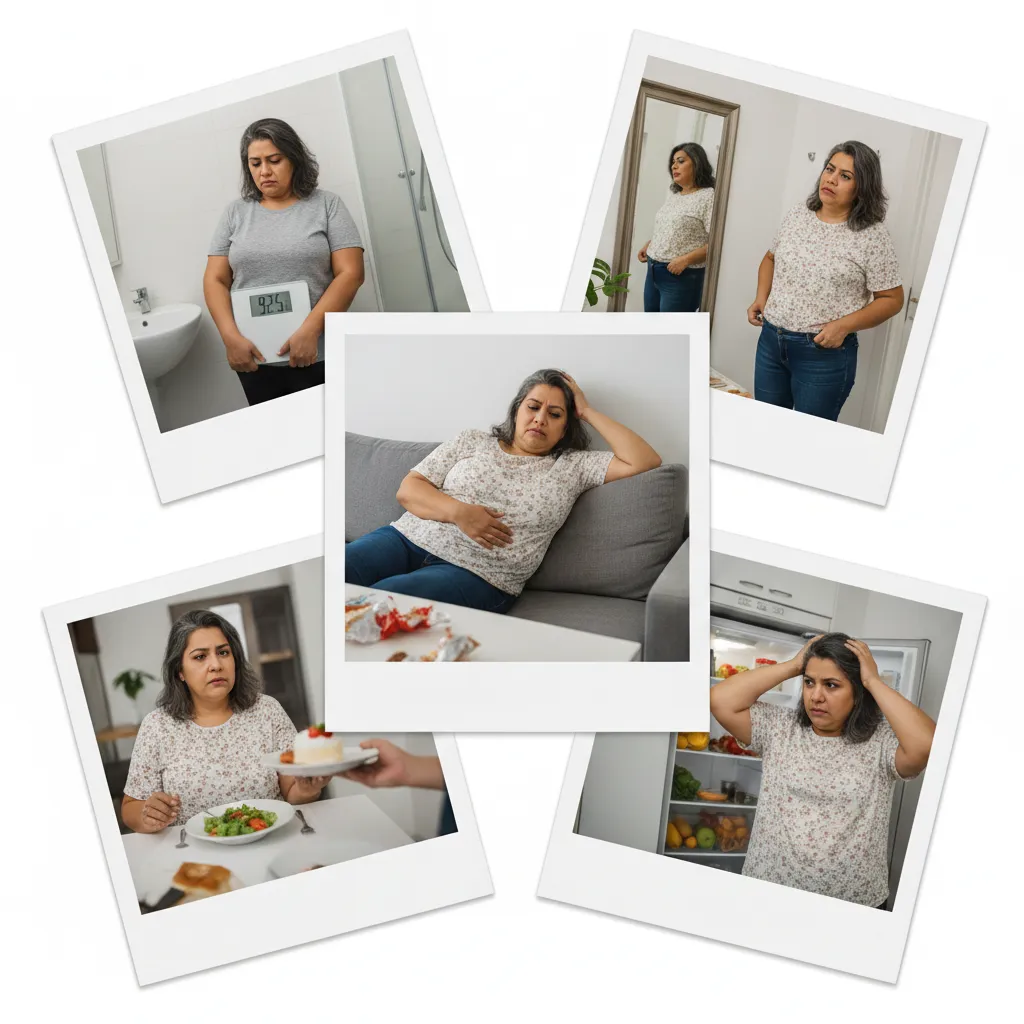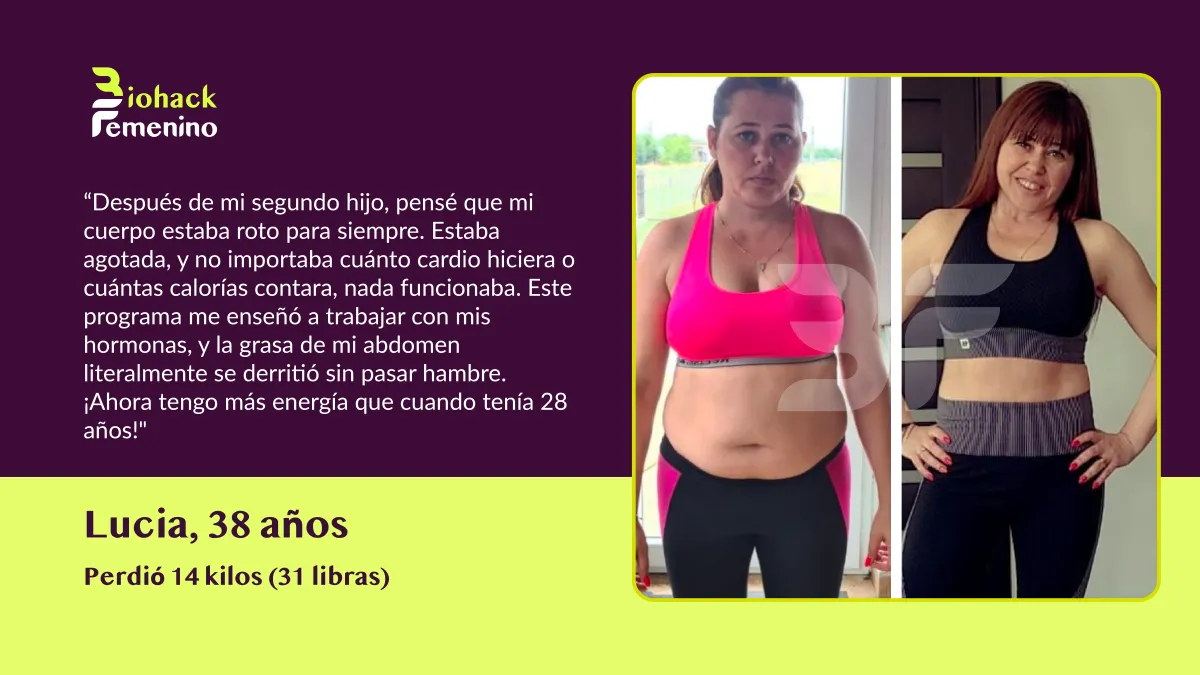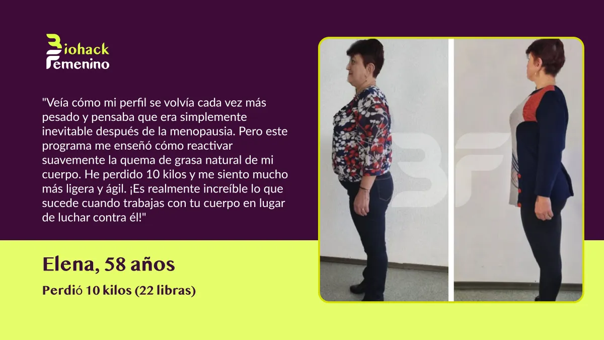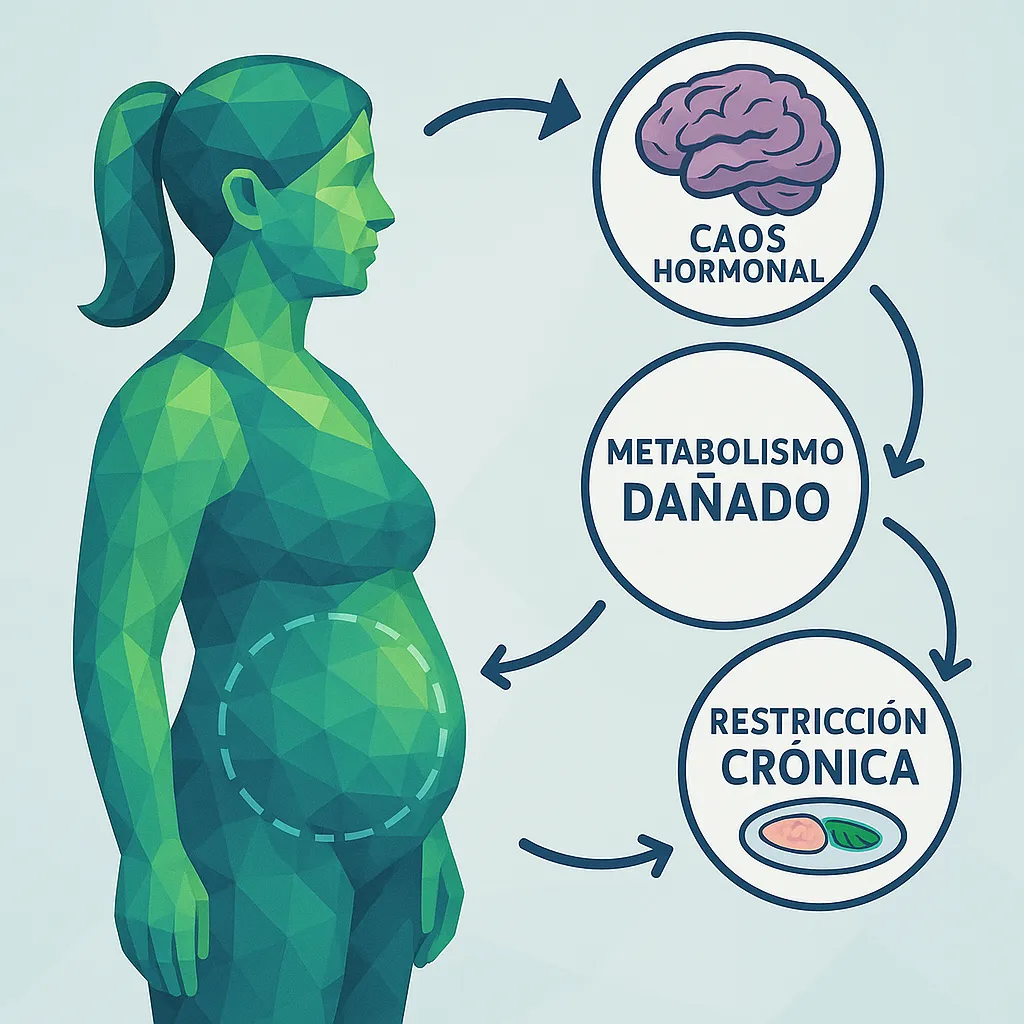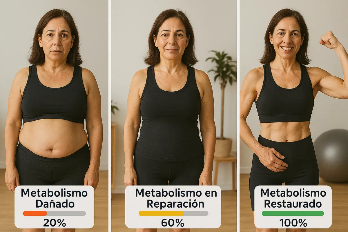 🚫 El Problema: Las dietas restrictivas destrozaron tu metabolismo. La menopausia cambió tus hormonas. Ahora tu cuerpo lucha por mantener cada kilo, sin importar lo poco que comas o cuánto ejercicio hagas.