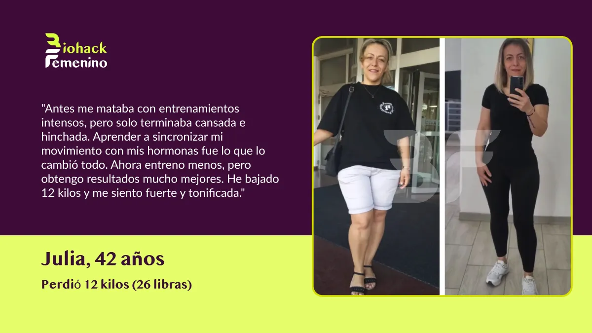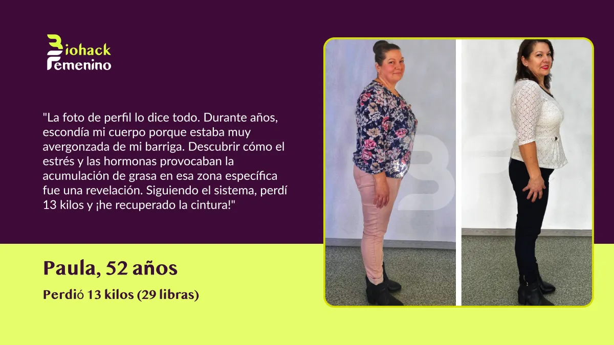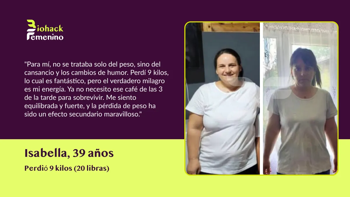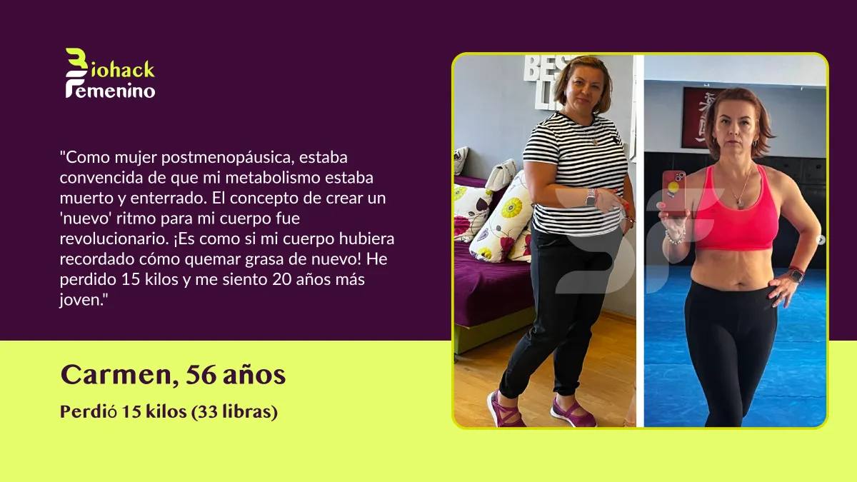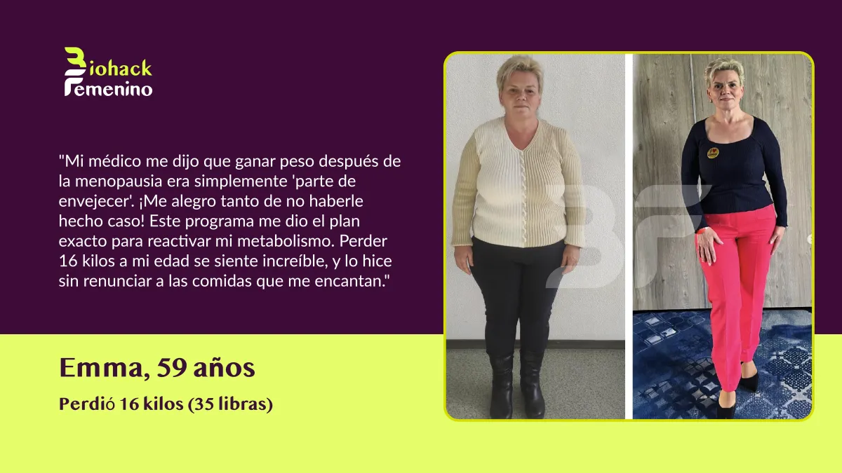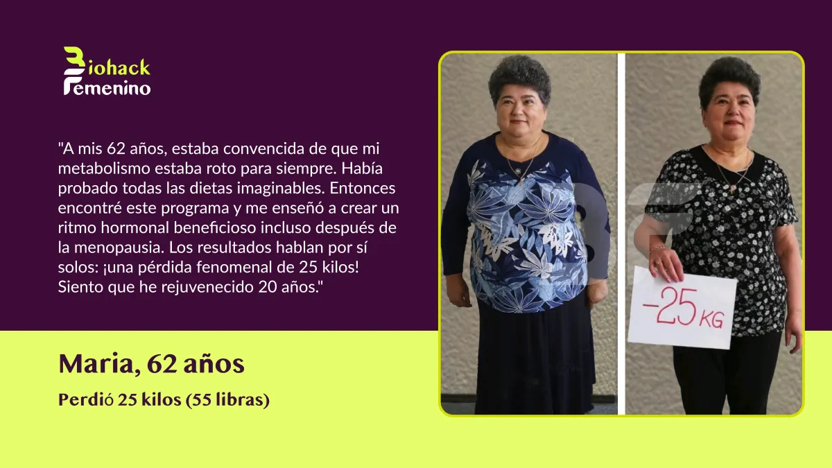 🚫 El Problema: Las dietas restrictivas destrozaron tu metabolismo. La menopausia cambió tus hormonas. Ahora tu cuerpo lucha por mantener cada kilo, sin importar lo poco que comas o cuánto ejercicio hagas.